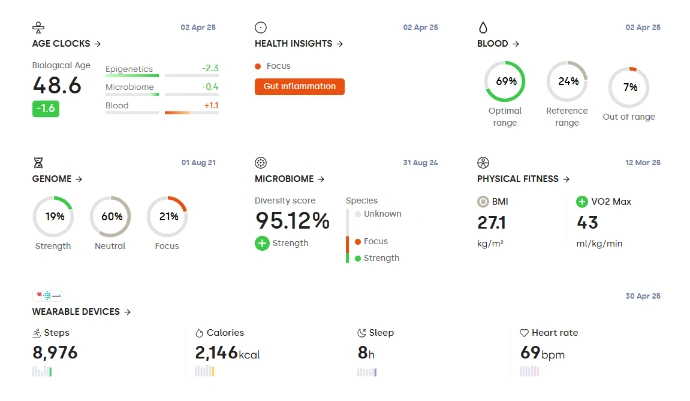 Laat cliënten en atleten genetische, epigenetische en microbioom-thuistesten afnemen die automatisch aan het digitale profiel worden toegevoegd.